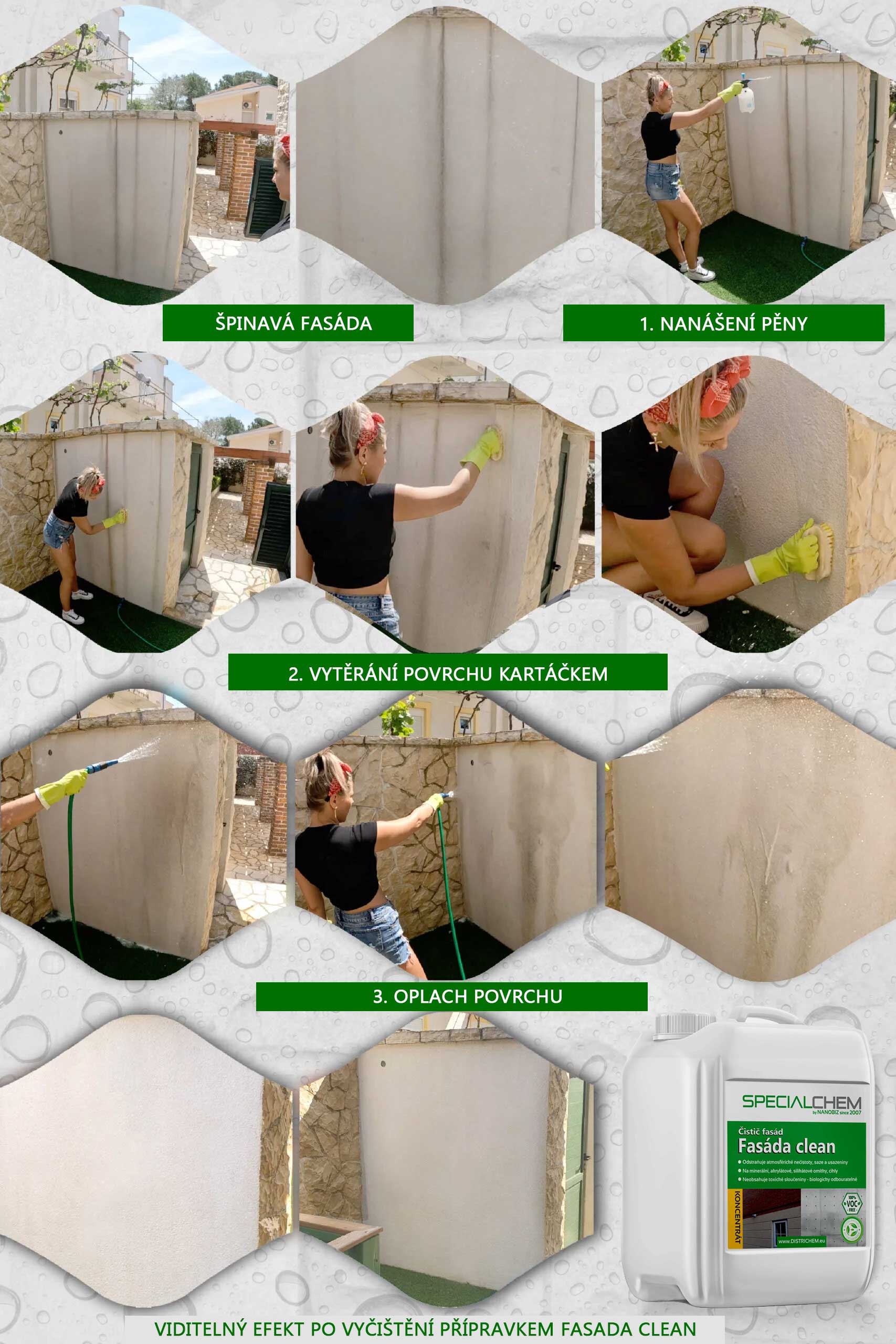 Aktivní pěna pro čištění všech typů omítek a fasád. Ideální pro akrylátové, silikátové, silikonové omítky, beton, cihly, kabřinec, pískovec, vápenec, žula a další minerální povrchy. Je bezpečný a neobsahuje silné kyseliny a je určen pro použití jak odbornými firmami, tak jednotlivými uživateli.