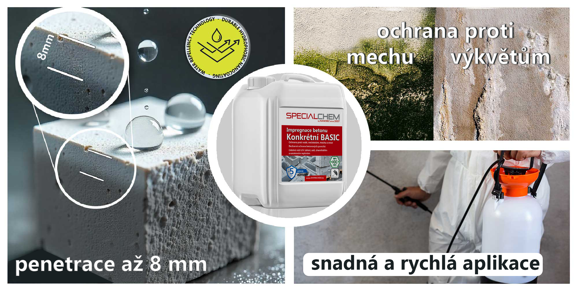 Impregnace Specialchem Concrete Basic je velmi účinná a v závislosti na množství použitého přípravku dokáže proniknout až do několika milimetrů. Proto je tento přípravek ideální pro použití na stěny, podlahy a parkoviště.
