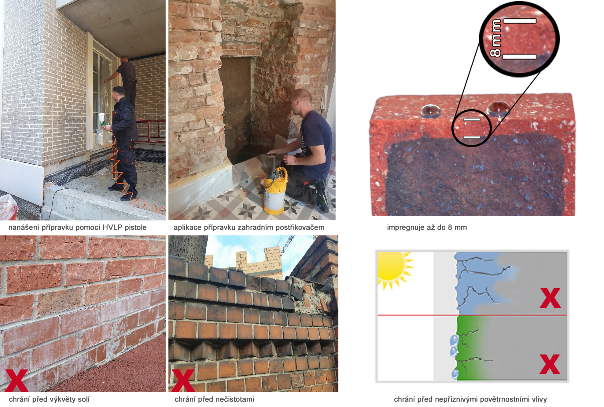 Impregnace proniká do cihly až 8 mm a chrání ji před nečistotami, deštěm a dalšími škodlivými faktory. Výrobek je určen k použití na fasády budov, ploty, řezané cihlové obklady, cihlové zdi, podlahy, střechy, sklepy a stěny uvnitř budov.